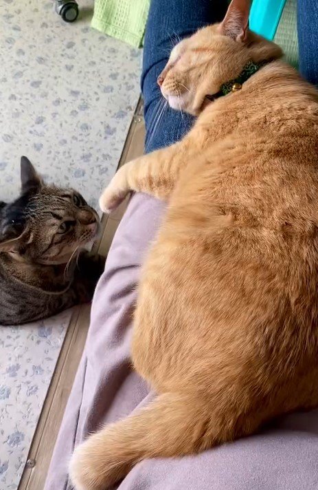 大好きなママのお膝に乗りたい猫さんたちの、かわいい映像がTwitterに投稿され注目を集めています。