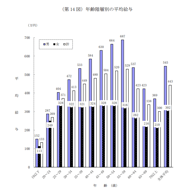 国税庁の同資料では、男女別・年齢別の平均年収も公表されています。