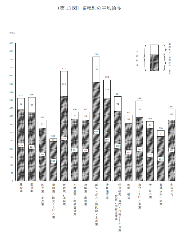 次いで高いのは「金融・保険業」の677万円、その後「情報通信業」の624万円と続きます。
