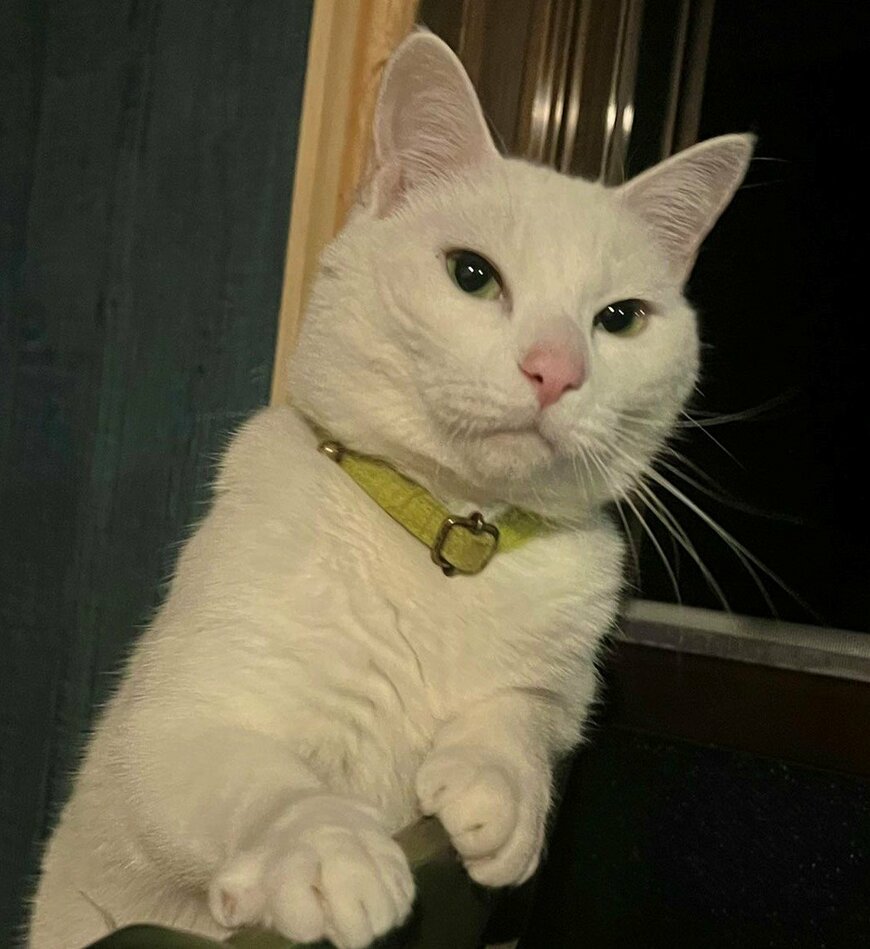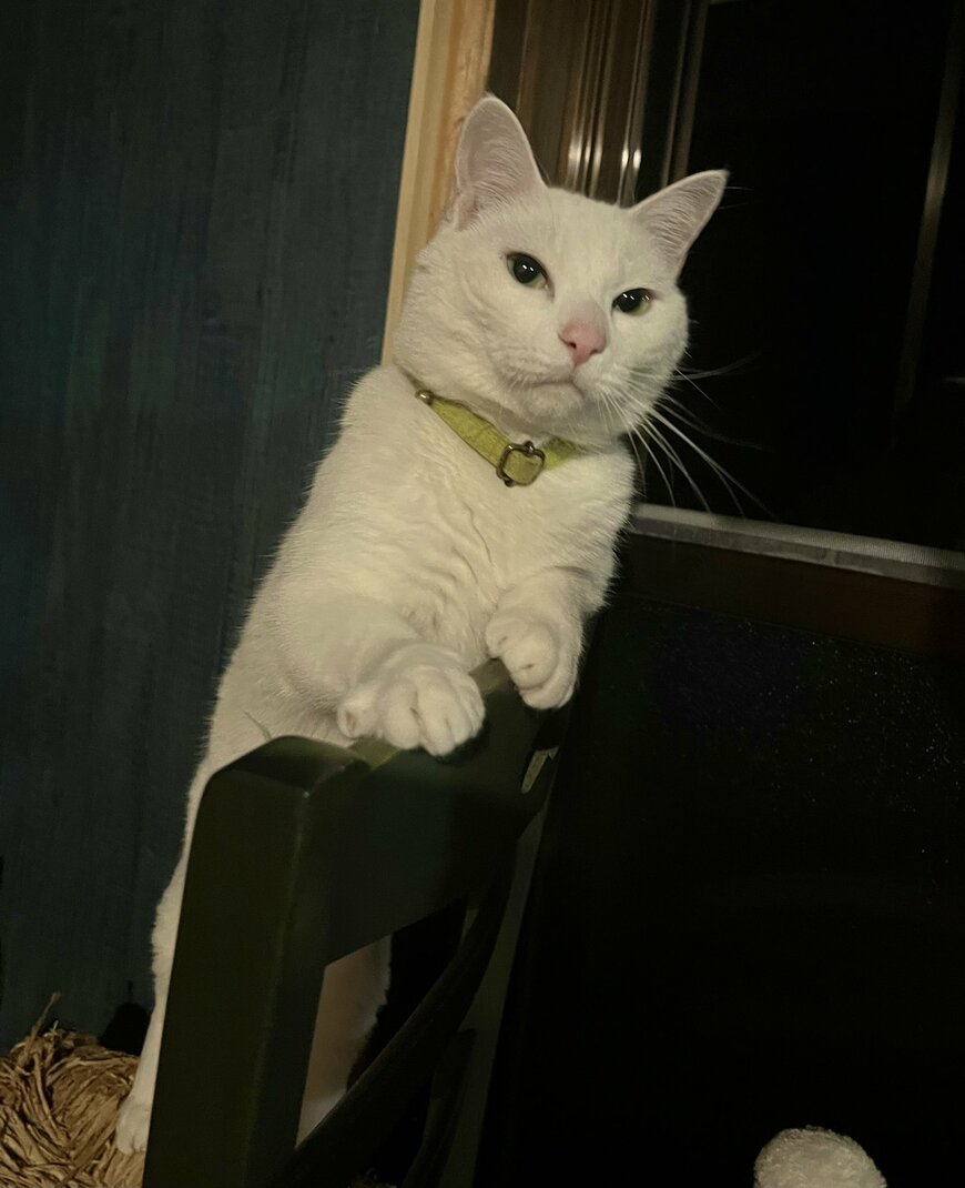 写っているのは1匹の白猫さんです。イスのような場所に手をかけて、つかまり立ちをしているようですが……?