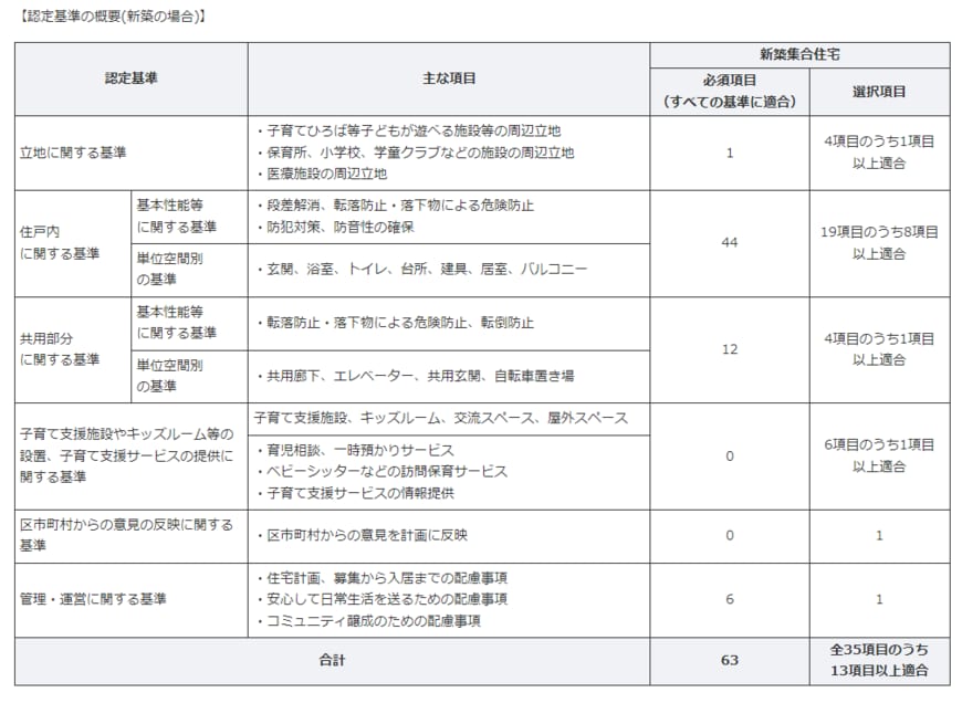 認定基準は「立地に関する基準」や「基本性能等に関する基準」、「子育て支援施設やキッズルーム等の設置、子育て支援サービスの提供に関する基準」などさまざまな項目があります。