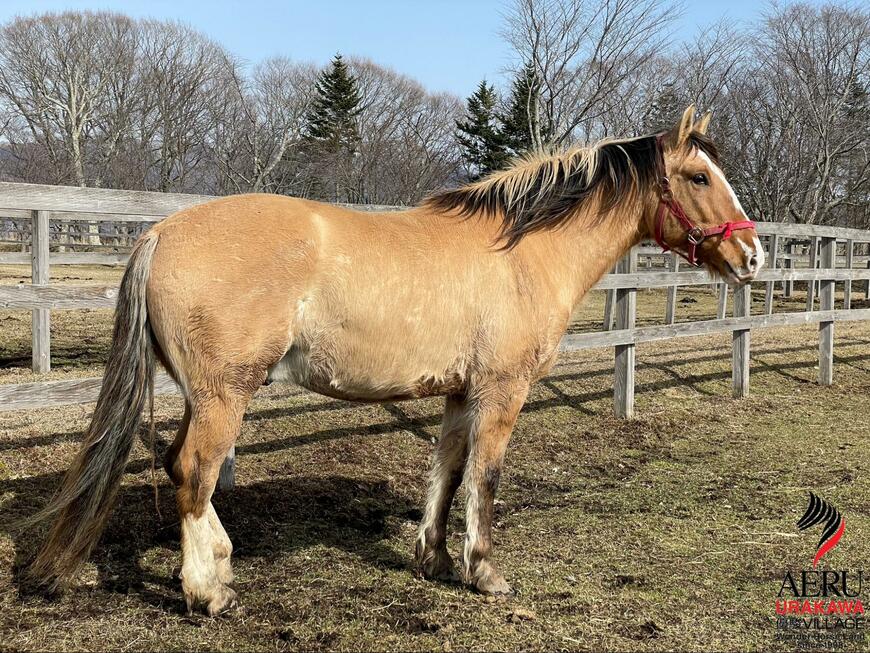 「アエルに新しい乗用馬が加わりました。その名も【ゴールドチップ】です。どこかの有名馬に名前が似ている気がしますね。体も名前もインパクトだらけの5歳の男の子です。どうぞよろしくお願いいたします。『あだ名はやっぱりゴルチかなぁ』」というコメントとともに投稿されたのは3枚の写真でした。