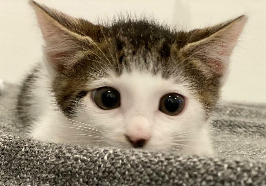 視線を惹きつける、子猫らしい大きなお耳やまん丸の瞳、そして「お顔の横から頭部を覆う、髪の毛のような配色」。素朴な愛らしさに癒される1枚です。