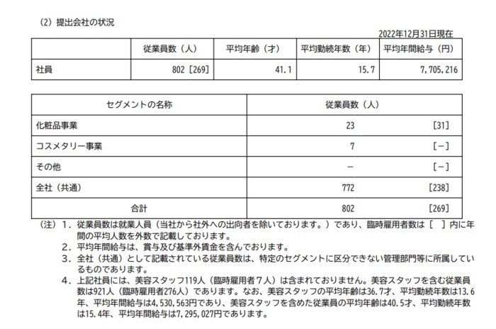 コーセー(提出会社)の2022年12月末時点での従業員数、平均年齢、平均勤続年数および平均年間給与は以下の通りです。