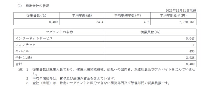 楽天グループ株式会社(提出会社)の2022年12月末時点での従業員数、平均年齢、平均勤続年数および平均年間給与は以下の通りです。