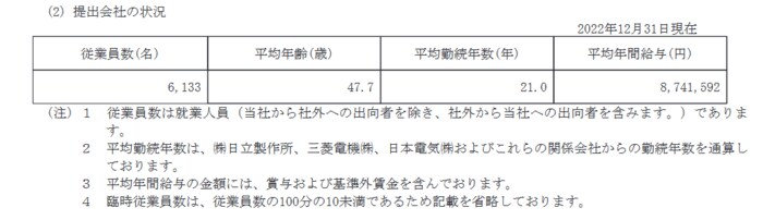 ルネサスエレクトロニクス(提出会社)の2022年12月末時点での従業員数、平均年齢、平均勤続年数および平均年間給与は以下の通りです。