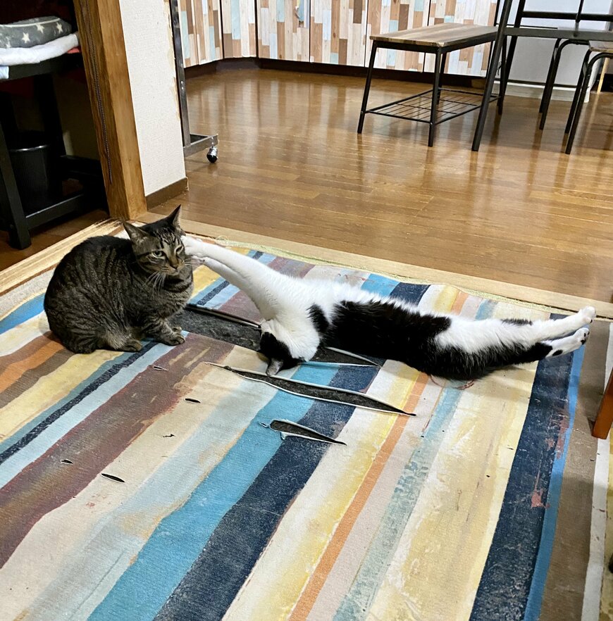 謎ポーズでたわむれる猫ちゃん達の姿をおさめた写真がTwitterで注目を集めています。