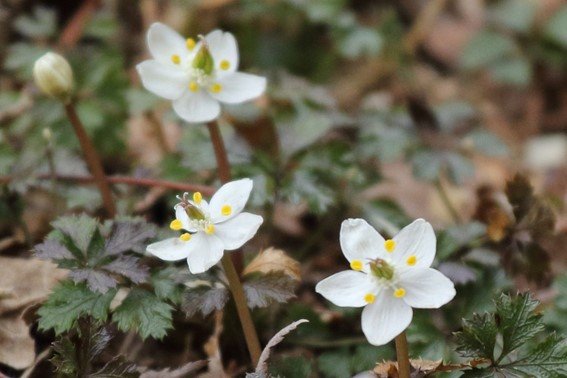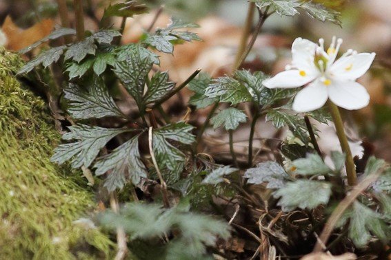 バイカオウレンは1.5センチほどの白い花を咲かせます。透き通るような白が清楚な雰囲気で、やや暗めの森林でひときわ明るく輝くよう。