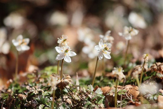 冬の寒さが残る早春から咲き始め、春の到来を告げるバイカオウレン。木漏れ日の当たる山林でひっそりと咲いている姿が可憐です。