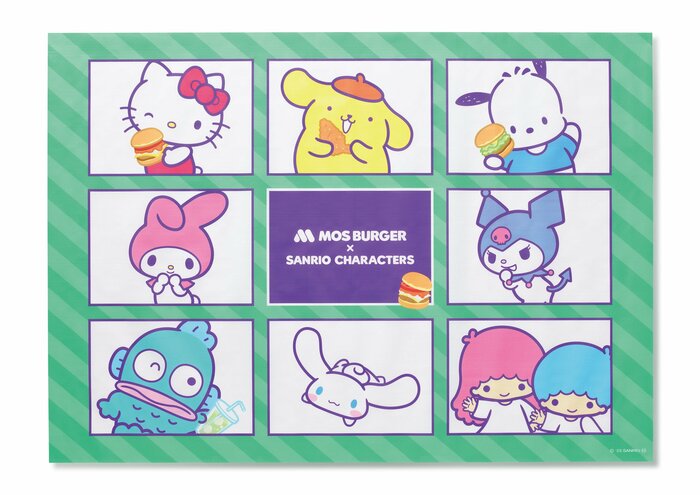 キャラクターたちが仲良くデザイン。モスバーガーの人気メニューと一緒に描かれています。