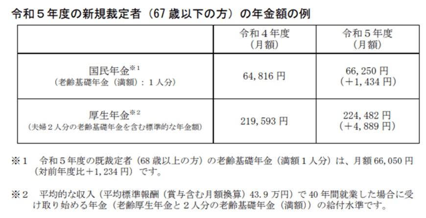 - 夫婦2人分老齢基礎年金含む満額:月22万4482円(4889円・2.2%増)