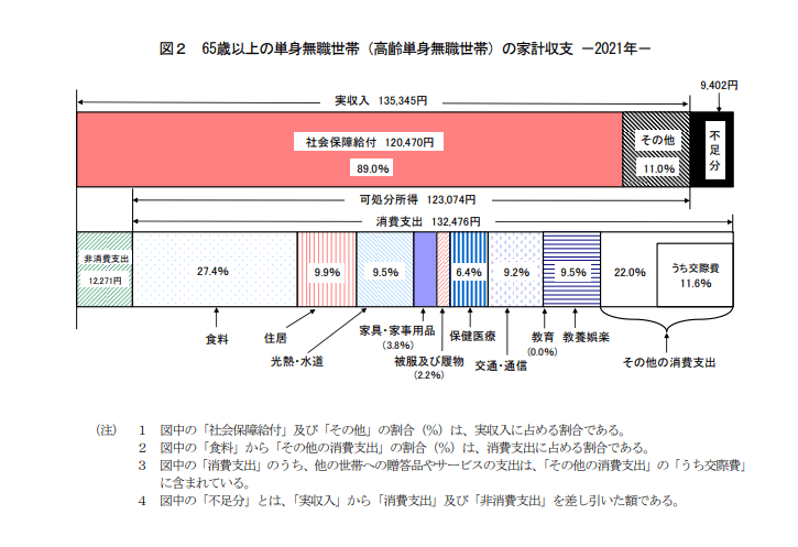 総務省統計局が公表している「家計調査年報(家計収支編)2021年(令和3年)」によると、65歳以上の単身世帯の1カ月あたりの生活費は、13万2476円です。