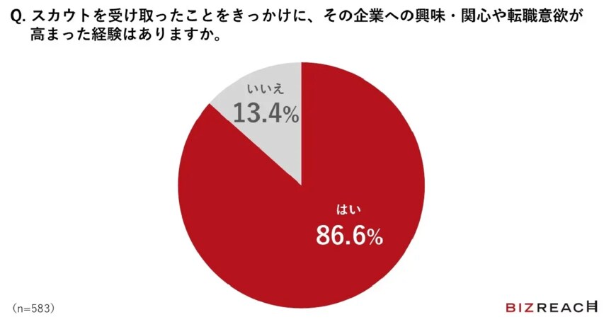 上記調査の結果、スカウトサービスを利用してスカウトを受け取ったビジネスパーソンの86.6%が、スカウトをきっかけに「その企業への興味・関心や転職意欲が高まった経験がある」と回答しています。