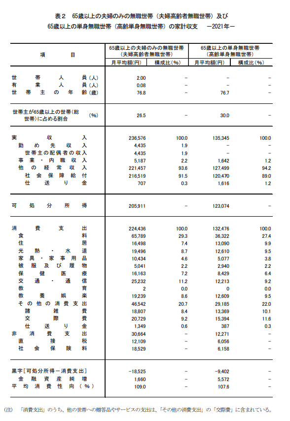 総務省統計局が公表する「家計調査年報(家計収支編)2021年(令和3年)」によると、65歳以上単身無職世帯の平均生活費は以下のとおりです。