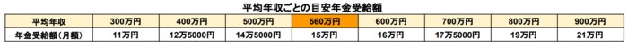 月平均15万円の年金を受給するには、平均年収560万円が必要です。国税庁によると、給与所得者における男性の平均年収は545万円なので、おおよそ平均年収に一致します。