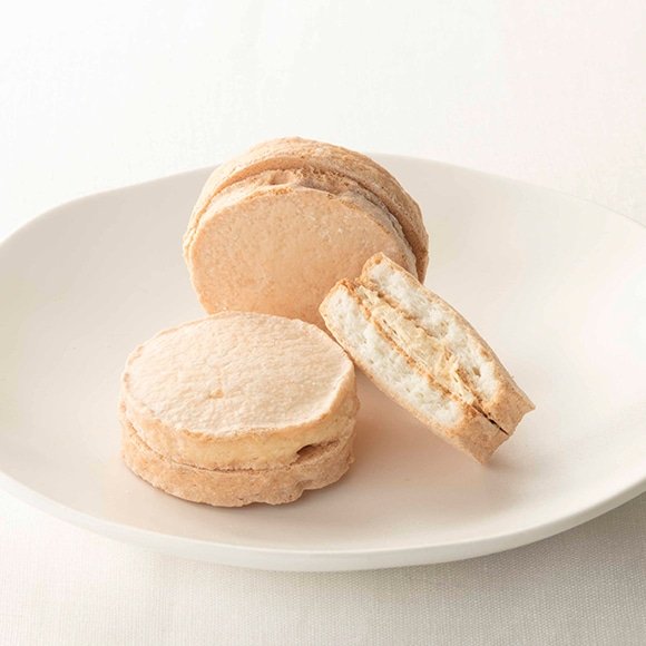 アーモンドパウダーときめ細かいメレンゲを合わせたアーモンド生地に米粉を加えているので、外はさっくり中はふんわり。さらに、練乳のミルキー感を加え、口どけのよい風味豊かなミルクキャラメルバタークリームをサンドした、お子さんたちも大好きなミルクキャラメル味の焼き菓子です。