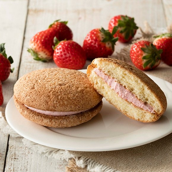 ふんわり食感で優しい甘みのブッセ生地と、程よい苺の酸味が広がるバタークリームのハーモニーが楽しめる焼き菓子です。