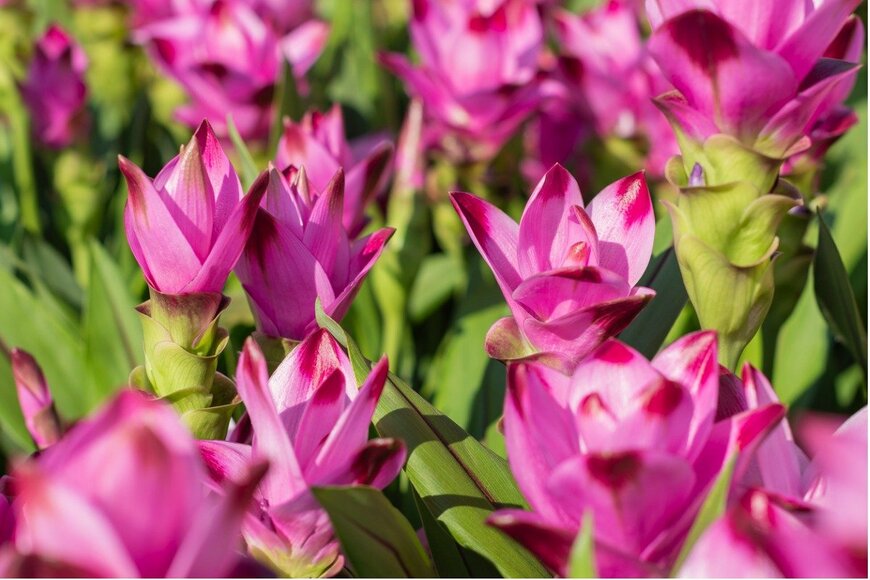 球根の植え付け適期は5~6月で、開花後は秋まで花が咲きます。クルクマは高温を好み、冬の寒さに弱い性質。球根は掘り上げて冬越しをしましょう。※参考価格:200円前後(1球)