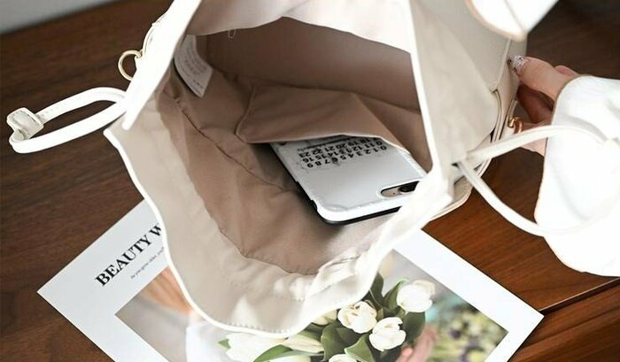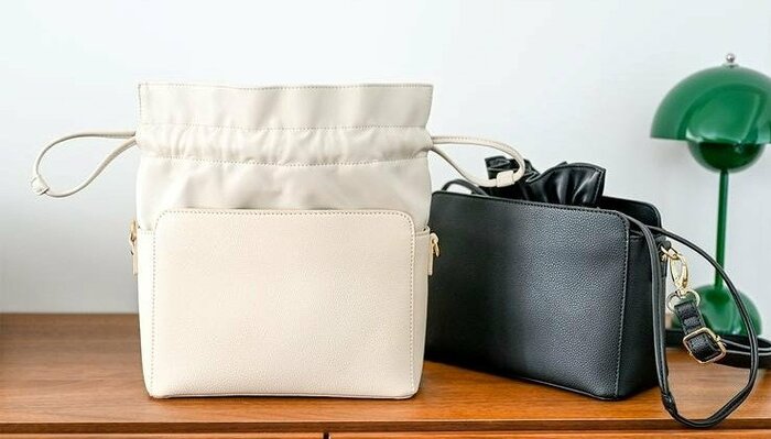 ショルダーバッグとしてだけでなく、巾着の紐部分を持ち手にしてハンドバッグとして使用することができます。