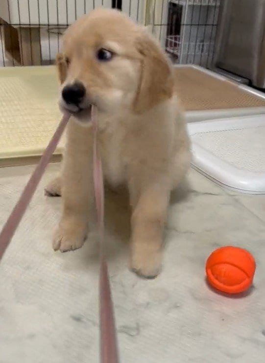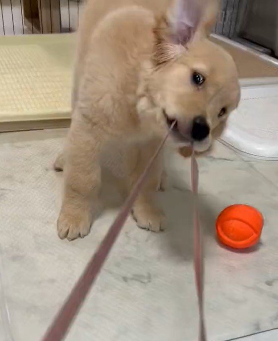 両足を踏ん張り、一生懸命ストラップを引っ張るつゆちゃん。プクッと膨らんだマズルがなんともかわいいです。