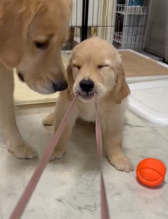 注目を浴びているのは、ゴールデンレトリバーの「ぷぅ」ちゃんと、ぷぅちゃんから産まれた子犬の「つゆ」ちゃんです。