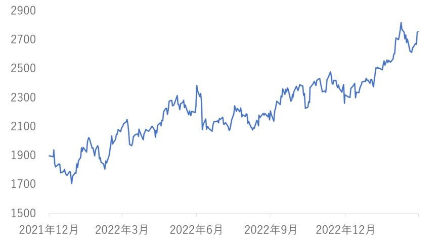 2021年12月30日の株価1898円(終値。以下も特記ない限り終値)で、2023年3月30日が2756円だったので、当該期間で45%上昇しています。
