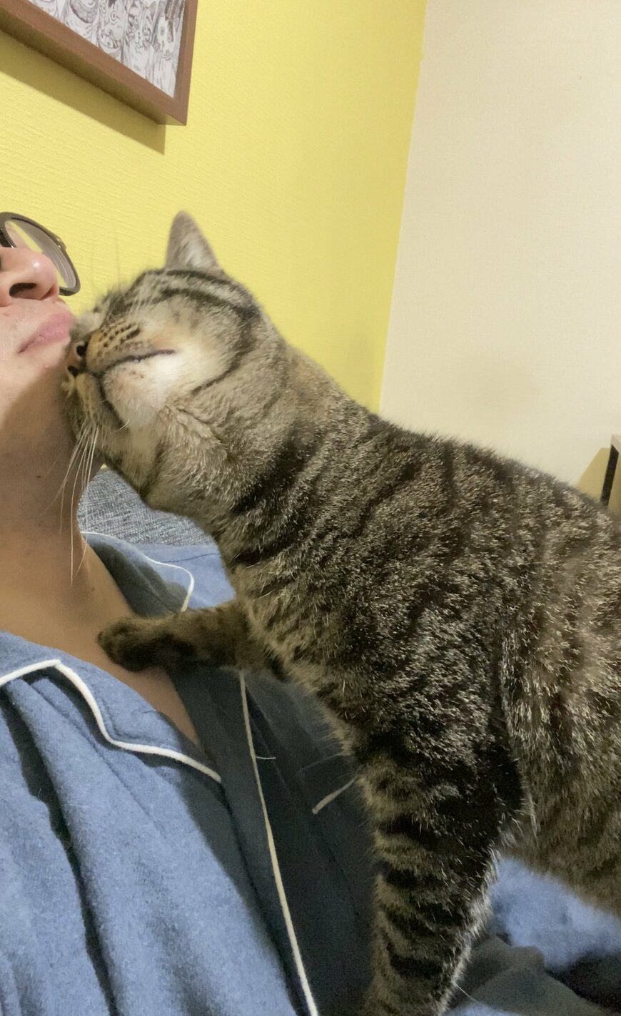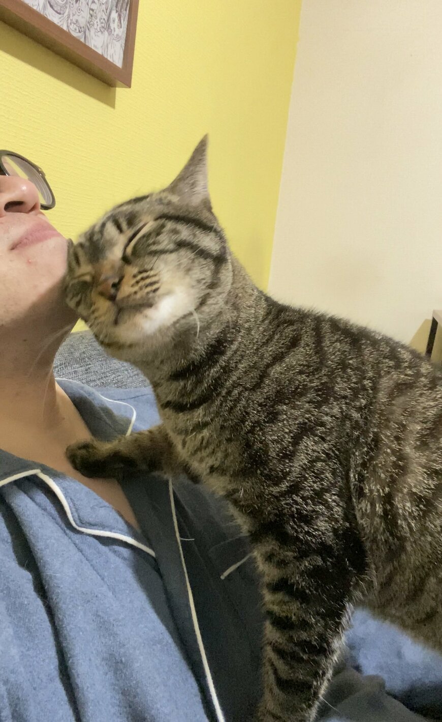 飼い主さんの首元に手を置くシイタケくんは、飼い主さんのお顔をめがけて頬を「スリスリ」。スリスリに夢中になっていることがうかがえる、目を閉じた表情がなんともほほえましいです。