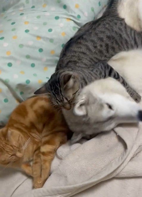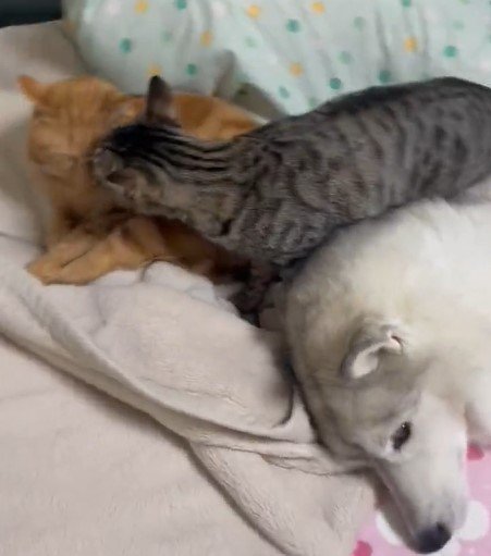 注目を浴びているのは、ハスキー犬の「ユキ」ちゃんと、茶トラ猫の「レン」くん、キジトラ猫の「サン」くんです。ユキちゃんは猫ちゃんたちにとってママのような存在で、この日はひとつの布団で「家族団らん」していた様子。