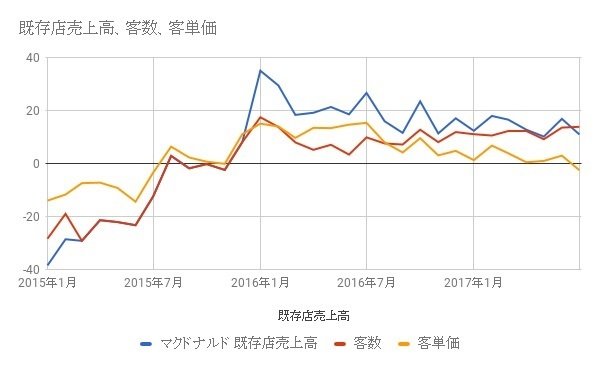 マクドナルドの既存店売上高は2015年11月以降、安定的にプラスに転じています。2016年1月の+35%増がピークとなっていますが、その後も高い水準で推移しています。実際、2017年5月は対前年同月比+10.1%増、6月は同+16.8%増、7月は同+10.9%増という数値でした。