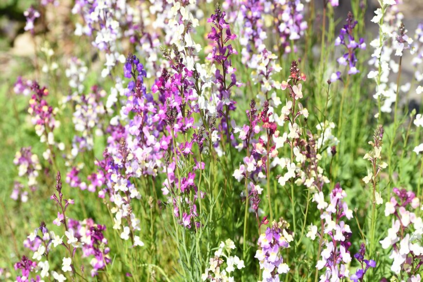 リナリアは金魚に似た小花が咲くので「ヒメキンギョソウ」とも呼ばれる花。細い茎が風にしなやかに揺れる様子は野趣にあふれています。こぼれ種からも旺盛に増えるほど強健な性質です。※参考価格:200~400円前後(3号ポット苗)