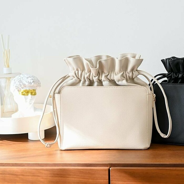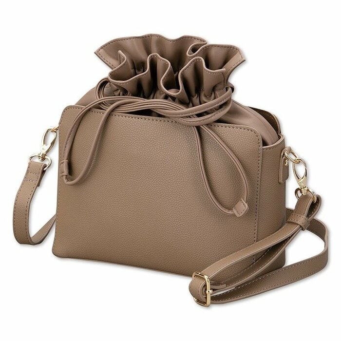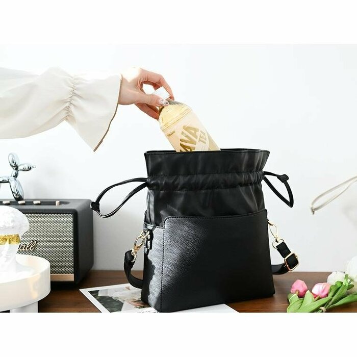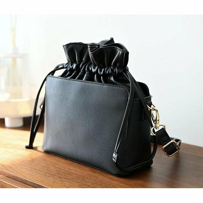 ボディは型崩れしないハリ感のある合皮タイプの生地を使用。また、巾着部分はソフトな生地を使用し、開閉などを考えた使いやすさバツグンのバッグです。見た目はコンパクトなのに長財布やスマホもしっかり収納できるスグレモノ。巾着バッグとしてはもちろん、付属のショルダーストラップを付けて巾着ショルダーバッグにしたり、巾着部分を内側に折り込んでシンプルなスクエア型バッグとして持ち歩くなど気分に合わせてスタイルが楽しめます。