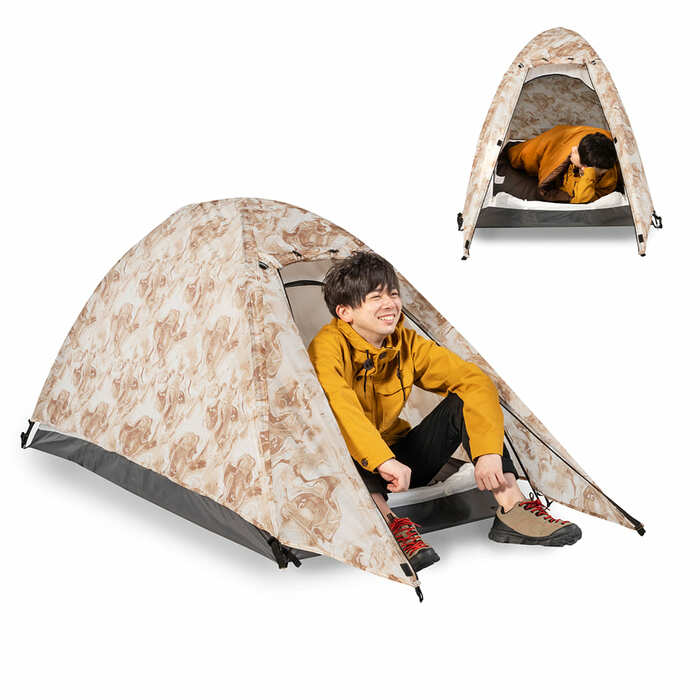 「ミシックドームテントAG 1人用」は、狭いスペースでも設置しやすい縦長の形状のソロテントです。