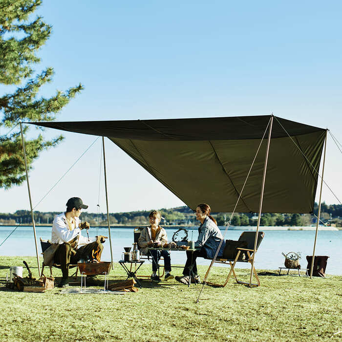燃えにくい加工がされており、火の粉が飛んでも燃え広がりにくいほか、耐水圧2000mmで耐久撥水してくれます。よく晴れた日や空模様が心配な日のキャンプにはぜひ持っていきたいですね。日中を快適に過ごすためのスペースがあると、楽しさも深まりますよ。