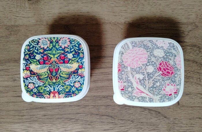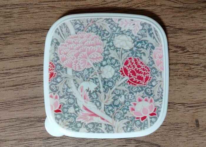 こちらがセリアで販売されているモリスデザインのミニケースです。2個セットで110円(税込)となっています。いちご泥棒(写真左側)とクレイ(写真右側)のデザインが素敵なセットとなっています。