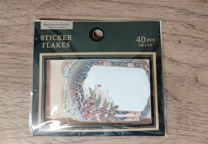 シールといったちょっとした雑貨をいれるのにも便利です。こちらはセリアで販売されている「モリスデザインのフレークシール」(JANコード4542804089752、税込110円)ですがぴったりとフィットしました。