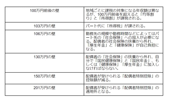 年収の壁は「103万円の壁」と「130万円の壁」がよく知られていますが、その他にもいくつかの壁があります。