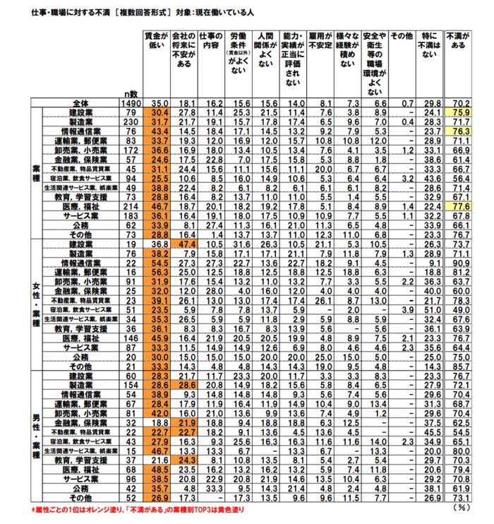 賃金の低さだけで見れば上記のような結果ですが、業種によっては他に関する不満が高くなっている場合もあります。