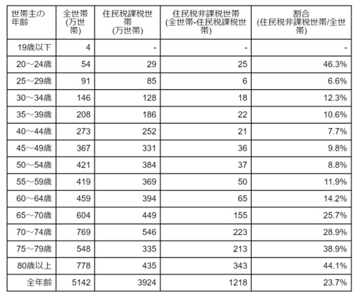 住民税非課税世帯は、世帯主の年齢が24歳以下の若年世帯や70歳以上の高齢世帯が多くなっています。
