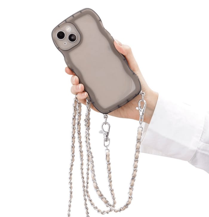 こちらのレザータイプも人気。フェイクレザーとチェーンで上品な印象を与えてくれます!肩や首に掛けると両手が空いた状態でスマートフォンを持ち運べて便利で、荷物が沢山ある時や、小さなお子さまの近くで手が離せない時など様々なシーンで役立ってくれます。スマートフォンでタッチ決済したい時にサッと取り出せるのがいいですね。