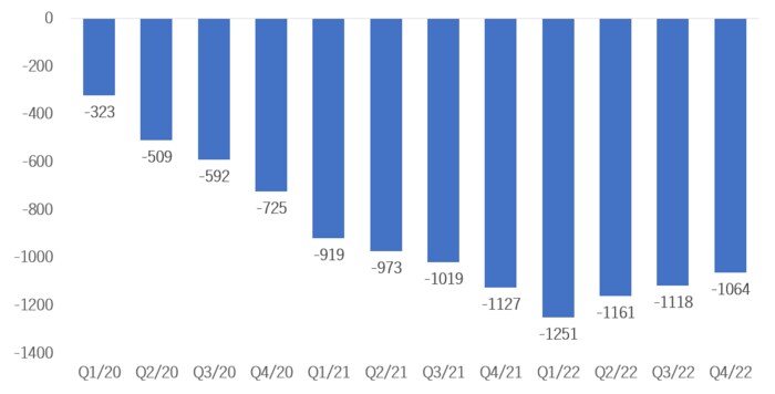 「モバイルセグメント」にまとめられている楽天モバイルの事業をみると、四半期ごとの同セクターのNon-GAAP営業利益は下図の通りで、2022年度第1四半期までは赤字が拡大しています。