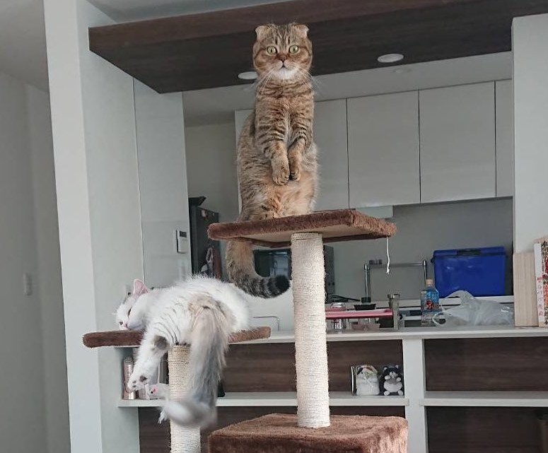 リプライ欄には「たぬ吉くんの誇らしげな立ち方!下にいる敗者のふて寝も愛らしいです」「最上段で立っち(笑)戦いに疲れたふて寝ニャンも、どちらも可愛い」「いつもは負けちゃうんだね、今日は満足そうですね!」といったコメントが多数寄せられ、投稿は盛り上がりを見せています。