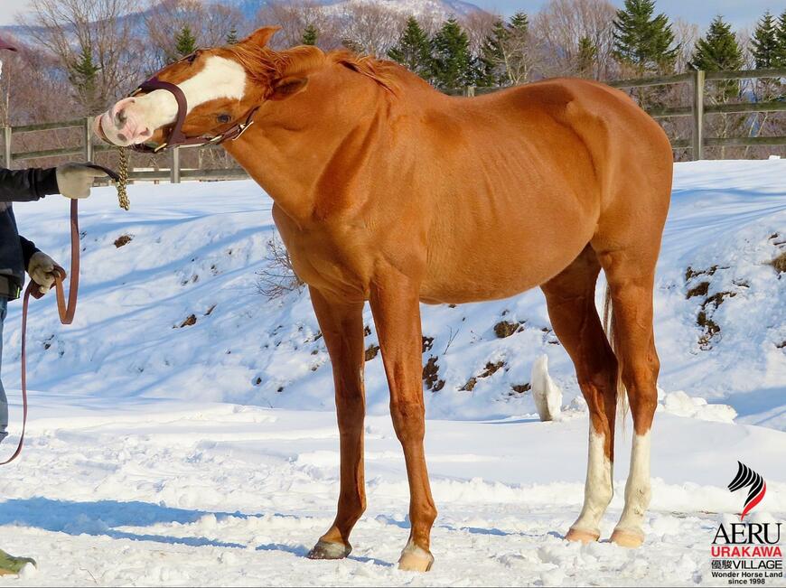 うらかわ優駿ビレッジAERUの担当者に撮影した経緯を聞いてみると、「やはり顔の大流星が特徴なので、その個性をたくさんの方に見ていただきたくて撮りました。顔の真ん中に大きな白い流星があるので、『エクレア』と言われたり、鼻先も真っ白の中に黒く丸い模様がある事から、『豆大福』と言われたりしています」とのこと。