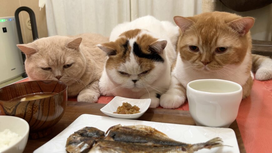 干物を前に「ジッ……」猫達の圧巻の光景にSNS大反響