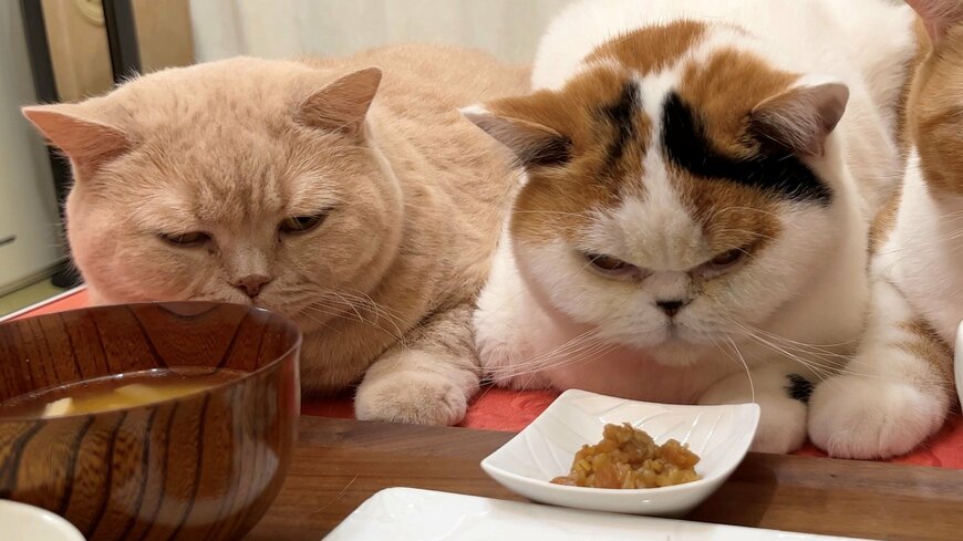 左側にいる「みかん」ちゃんと中央にいる「あんみつ」ちゃんは、なんとも愛らしい猫圧が感じられる表情を浮かべていました。目の前にある干物を淡々と見つめる姿に、なんだかホッコリしてしまいます。