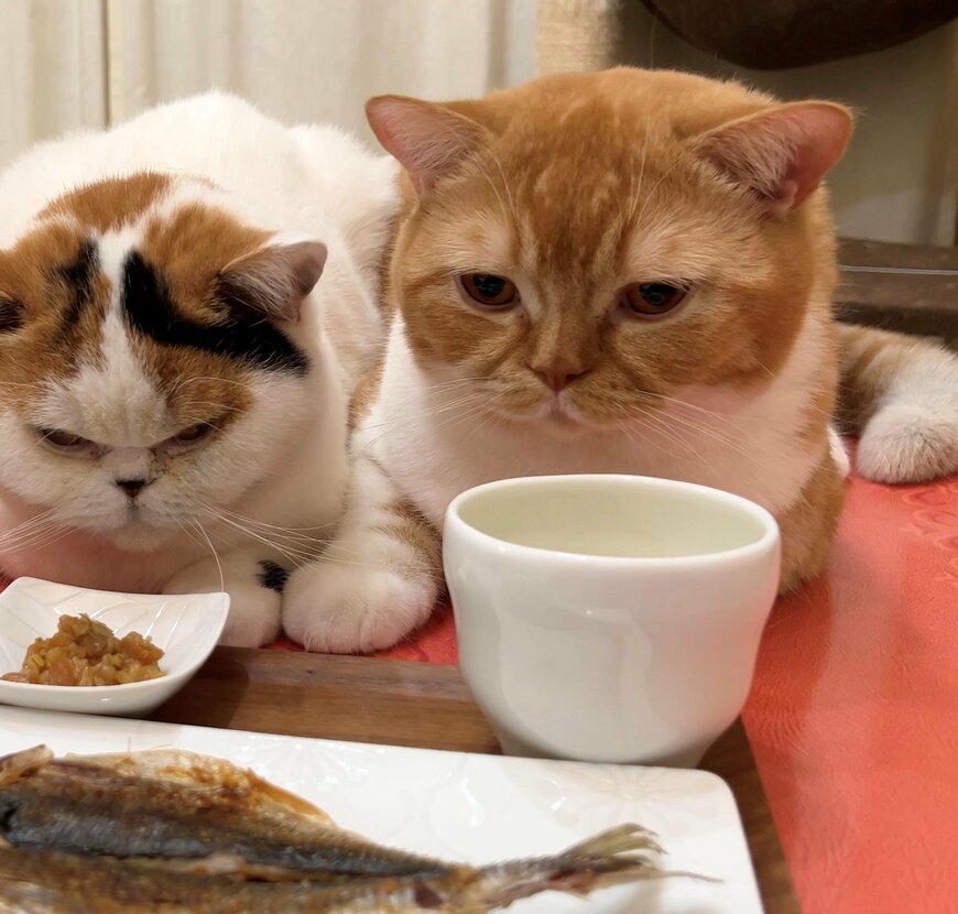 右側に居る「とんかつ」くんは、お耳を立てて目を丸くしながら、やっぱり干物を眺めています。「いい匂いがするなぁ……」と興味をそそられているのでしょうか。抜群の存在感に笑みがこぼれると同時に、可愛い猫ちゃんの「大集合」に癒される瞬間です。