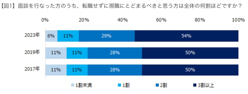 上記調査の結果、転職コンサルタントの54%が「面談した3人に1人は現職にとどまるべき人」と回答していることがわかりました。