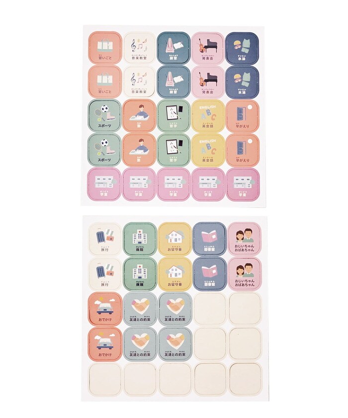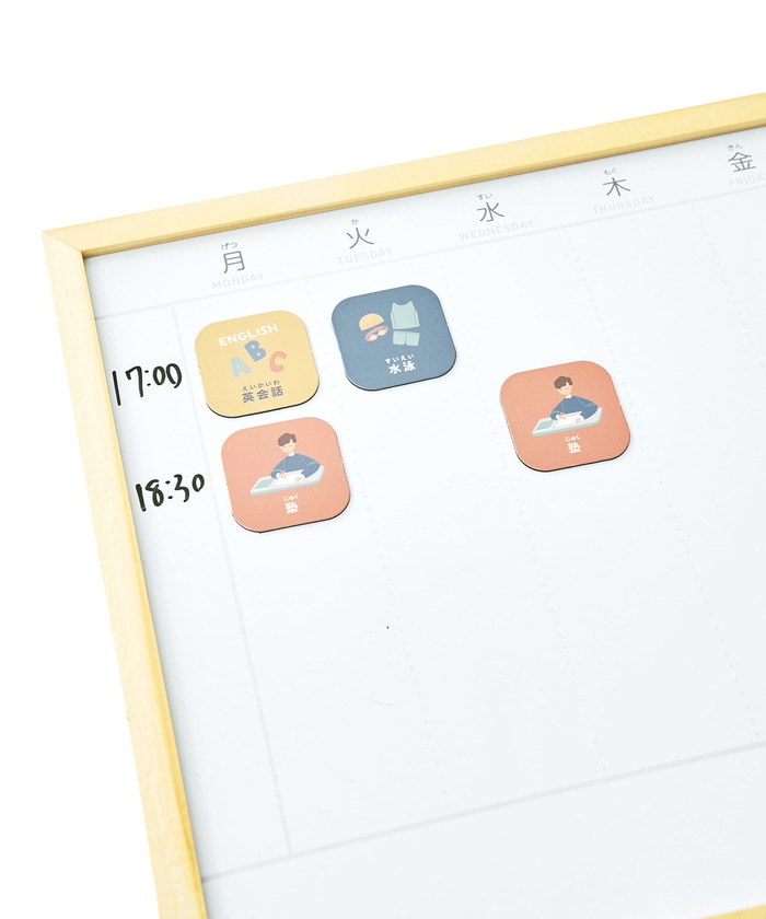 塾や病院、音楽教室など、お子さんの放課後スケジュール管理に必要なマグネットがそろっています。白紙のマグネットが9つもあるので、必要なマグネットを増やすこともできます。