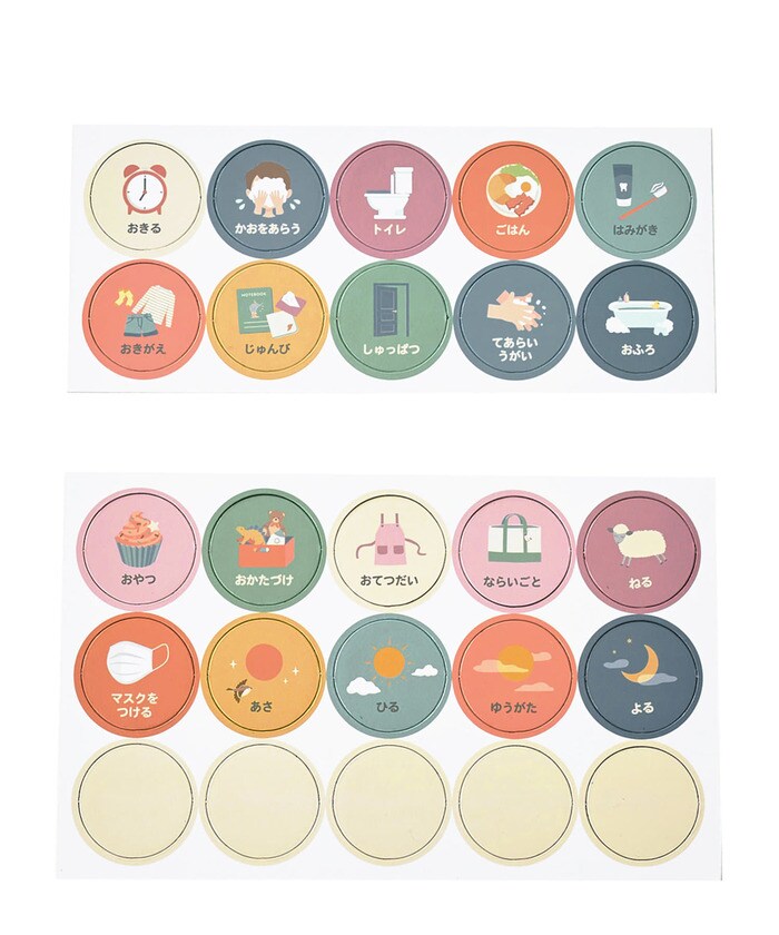 「トイレ」「ごはん」「ならいごと」といったスケジュール用のマグネットだけでなく、「あさ」「ひる」「よる」の時間マグネットも付属しています。