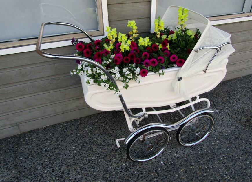 ベビーカー型のユニークな鉢もこだわりのポイントとなっています。キンギョソウをピンク系に、