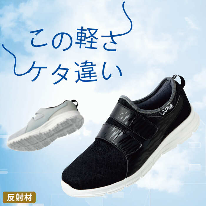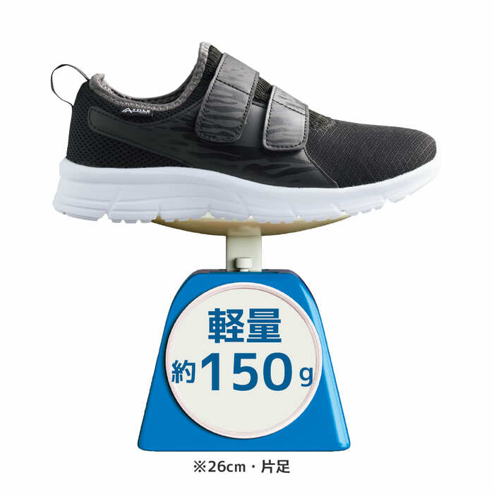 ダブルの面ファスナータイプのアスレシューズです。片足約150gの軽さ。履き口に厚めのクッションパッドを搭載したエッグホールド設計を採用しています。